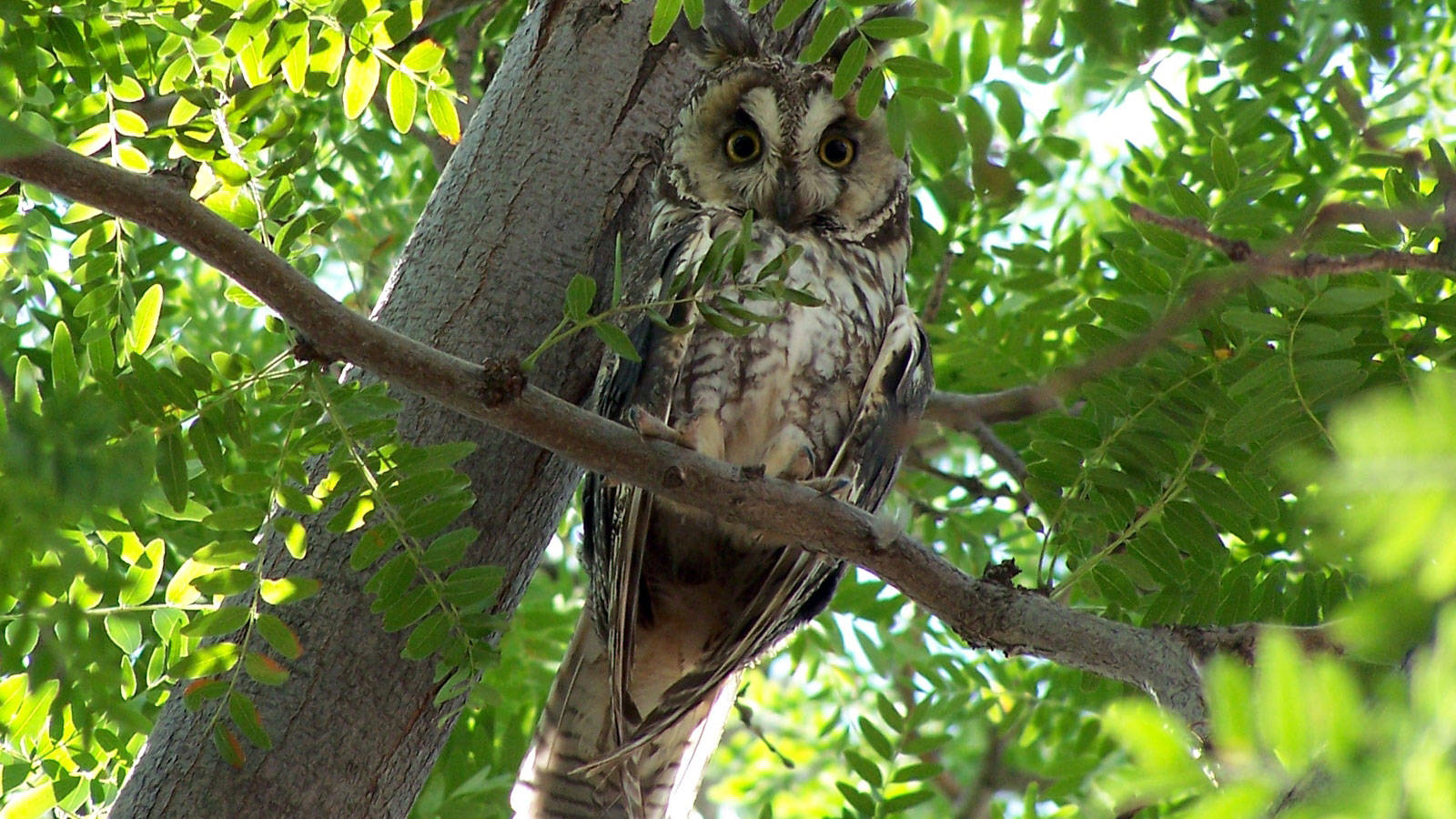 This medium-sized bird shares a few traits with other species. Like the barn owl, the shape of its face (sometimes called a “facial disk”) helps direct sound to its ears, and its soft, fringed wings help it fly silently through the air. Like the boreal owl, its ears are asymmetrical, allowing it to pinpoint prey more accurately. These qualities help the owl hunt aerially, flying over open spaces or under the tree canopy to swoop down on its prey and capture small mammals with its powerful talons. Unlike other owls, long-eared owls will roost together during the winter. The male makes a typical “who” sound, whereas the female makes a bleating sound, similar to a lamb.