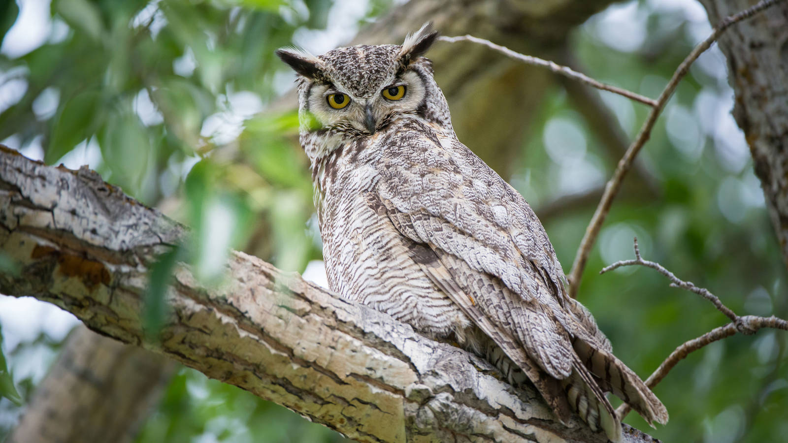 An aggressive hunter with a wide range throughout the continent, this bird is commonly pictured in storybooks and is the quintessential species many of us picture when we think of owls. Its deep hoots can be heard in a wide range of habitats, from forests to grasslands to swamps to deserts. It will typically steal a nest from another bird, such as a hawk or a crow, rather than make one from scratch. The great horned owl has the most varied diet of any North American raptor and will take down prey as diverse as rabbits, mice, voles, skunks, house cats, squirrels, ducks and other owls. It has even been known to attack porcupines — though these encounters often do not end well for either animal.