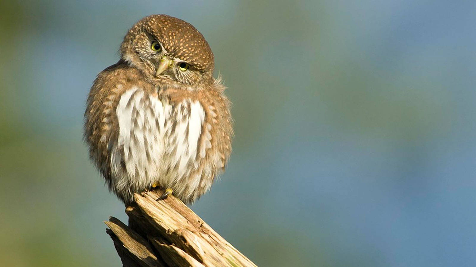 Small but fierce, this owl is only about 7 inches tall but will aggressively hunt and capture small mammals and birds twice its size — it has even been known to attack chickens, though songbirds at backyard feeders are more common prey. One of the least studied owls in North America, it lives in mountainous regions along the West Coast, nests in the hollows of trees, and is a rare diurnal species, meaning it is active during the day.