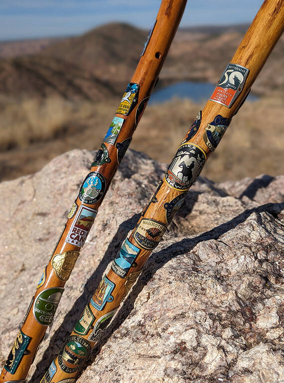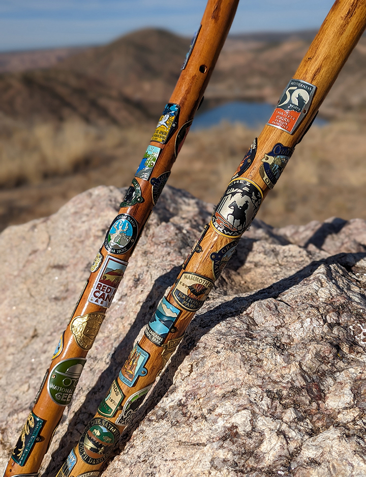 The couple’s hiking sticks, adorned with national park badges.